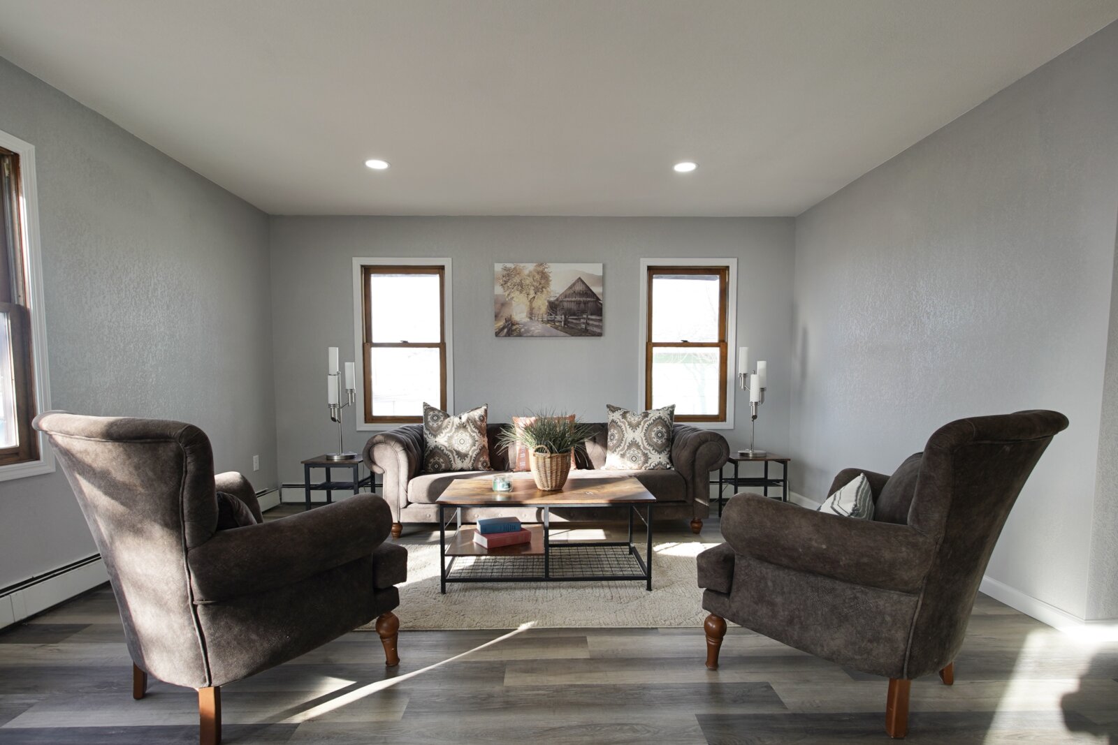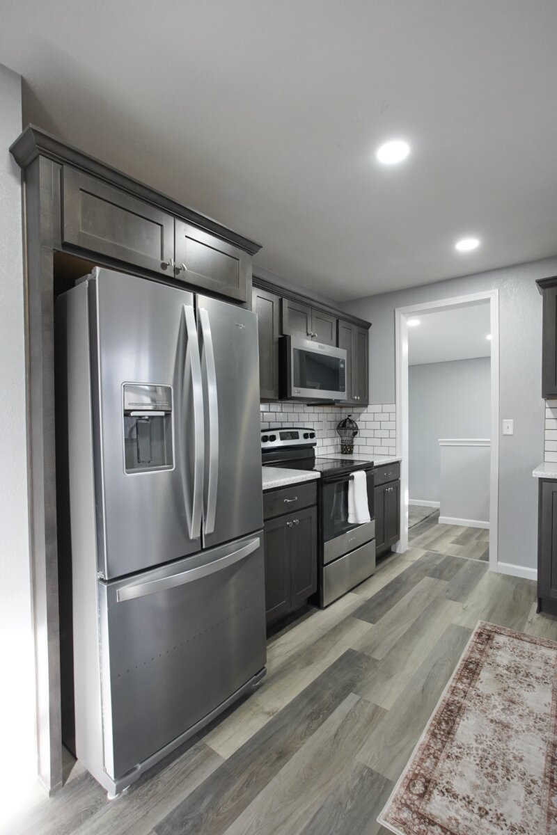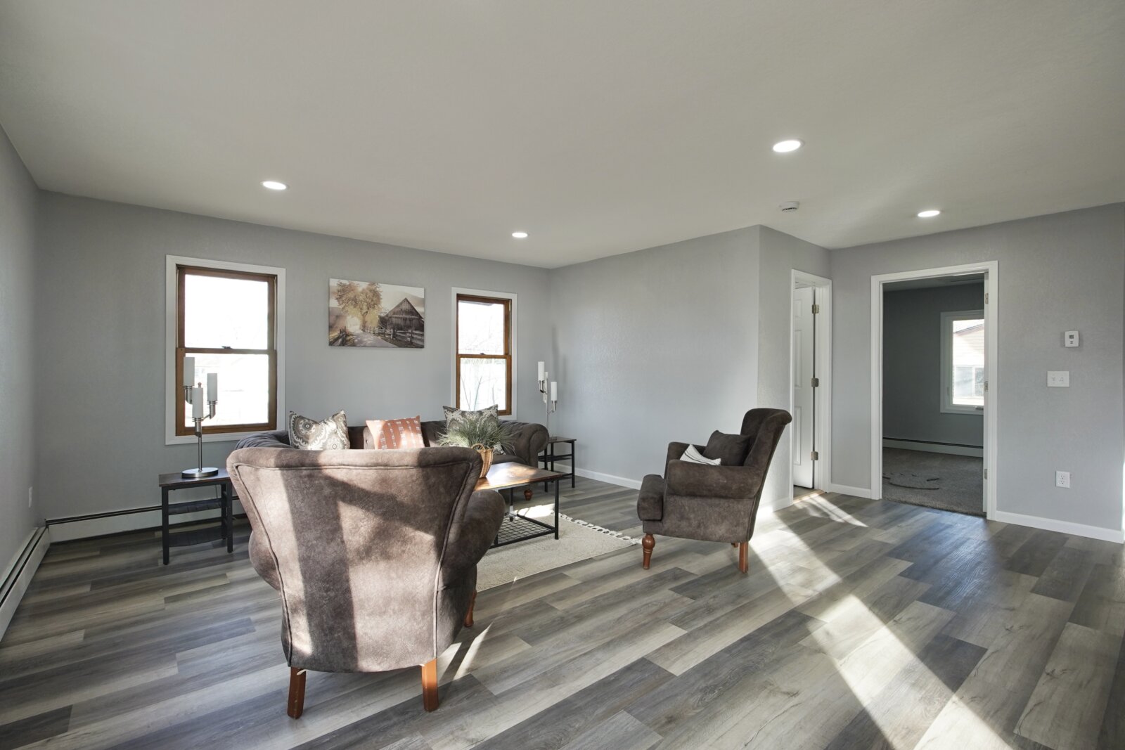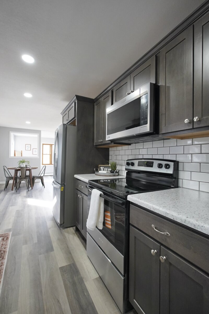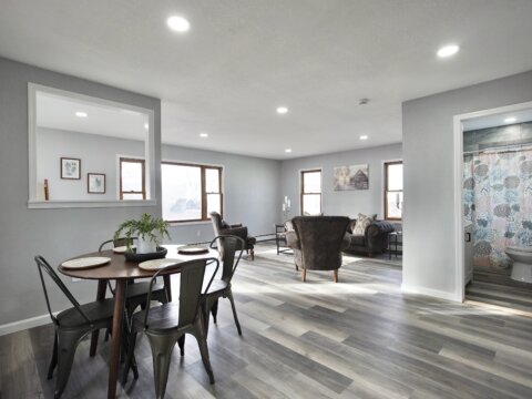 The main level features a huge living room that flows into the attached dining area, creating a spacious and functional layout. The new kitchen showcases rich dark brown cabinetry, stainless steel appliances, and a built-in pantry, providing both style and storage. Luxury vinyl plank flooring runs throughout the main level for a clean, cohesive look. This level also includes a large bedroom and a beautifully updated full bathroom.