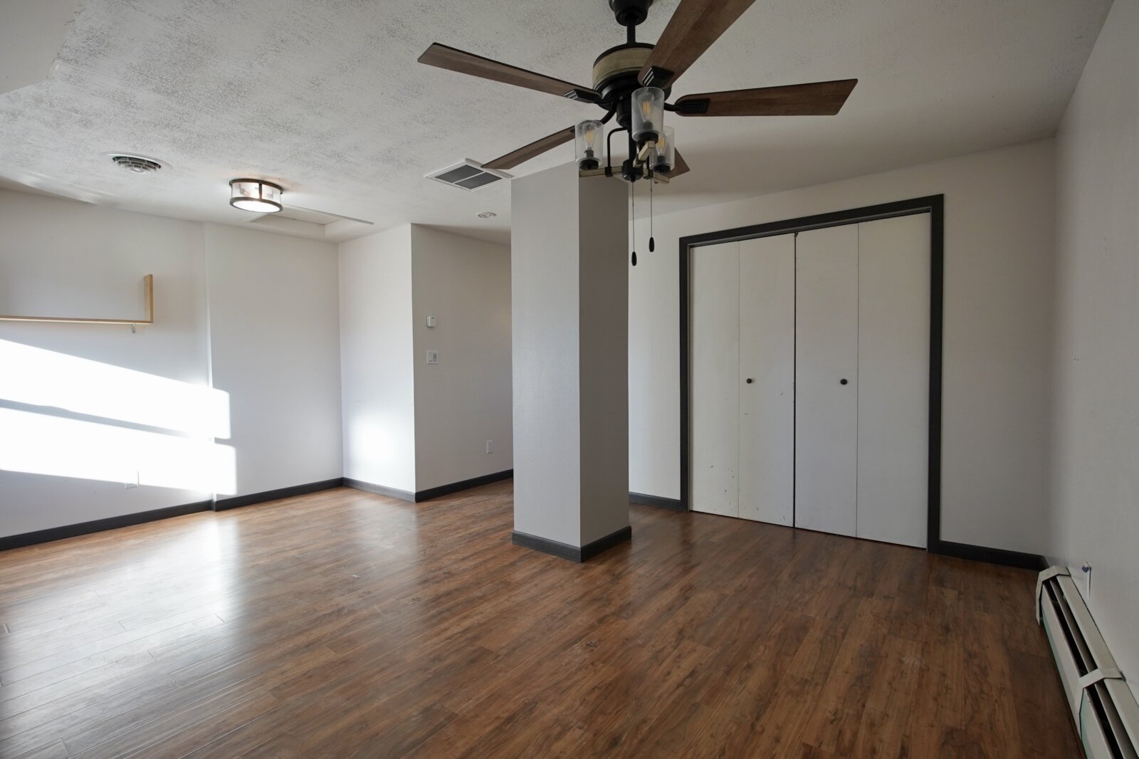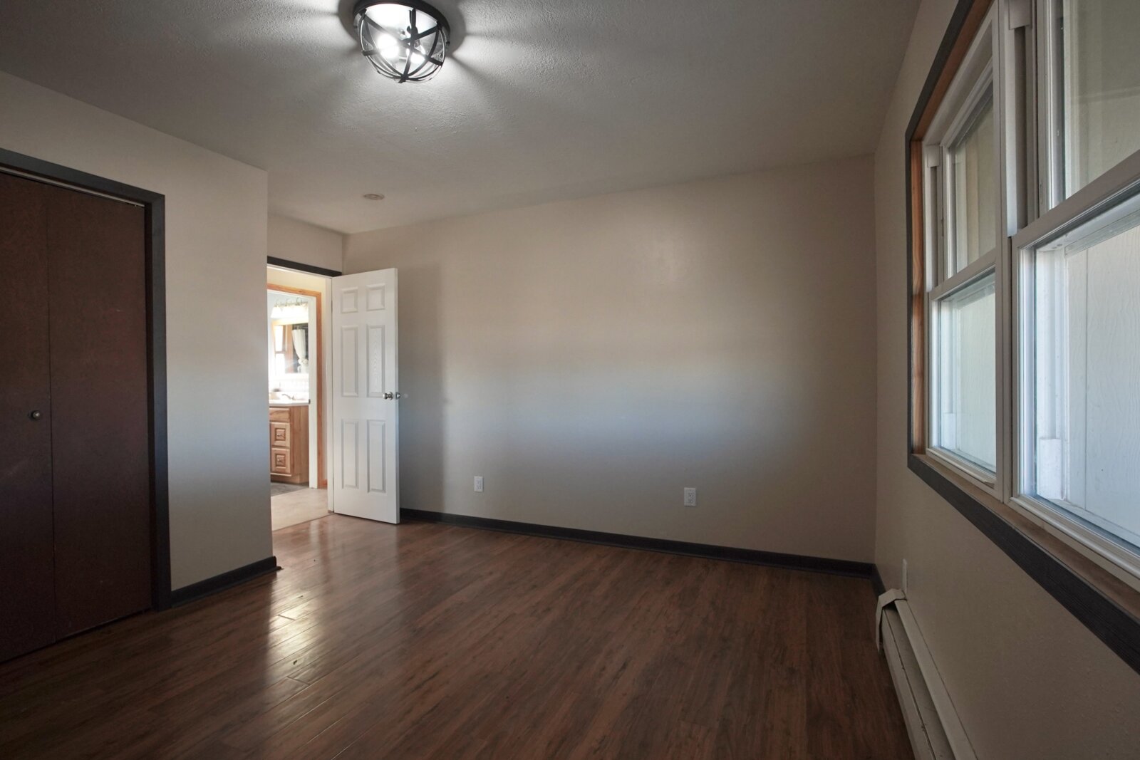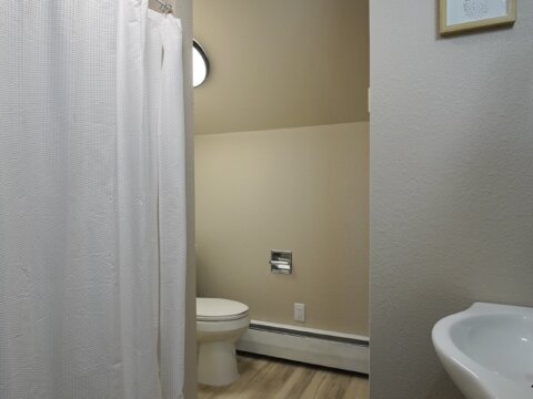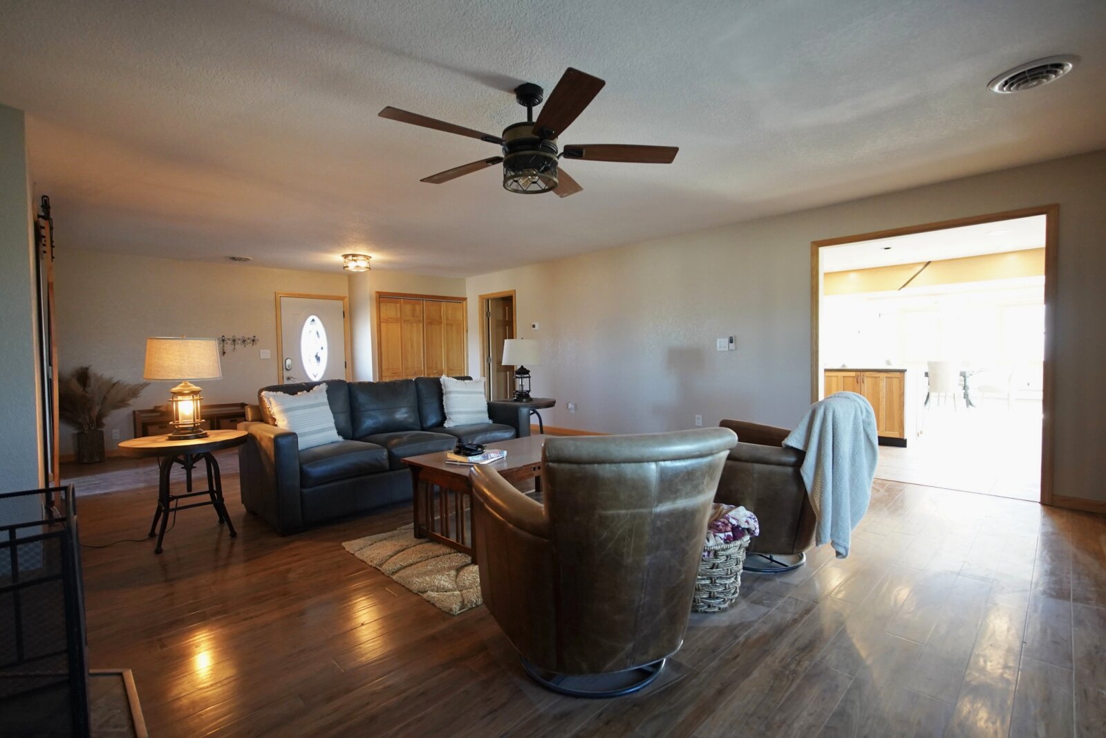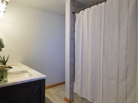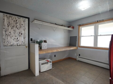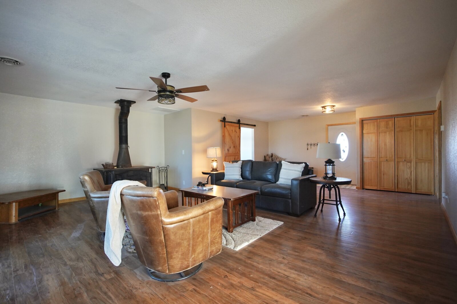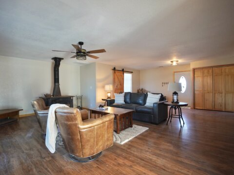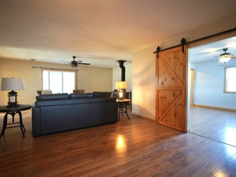 – When it’s chilly out, cozy up next to the oversized wood stove. The main floor primary suite adds to the ease of daily living. Plus it has this added privacy with the barn door right off the main living area. Primary bedroom is accompanied by an oversized walk-in closet, and a bathroom with newer updates throughout, an oversized six foot tub with an inline heater.