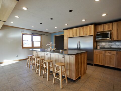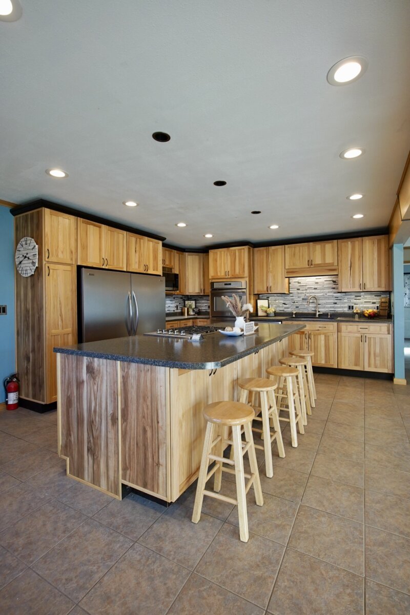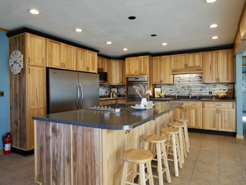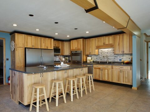 – [Blake] This kitchen features a nine foot island, Knotty Hickory cabinets, brand new tile back splash, and industrial grade appliances.