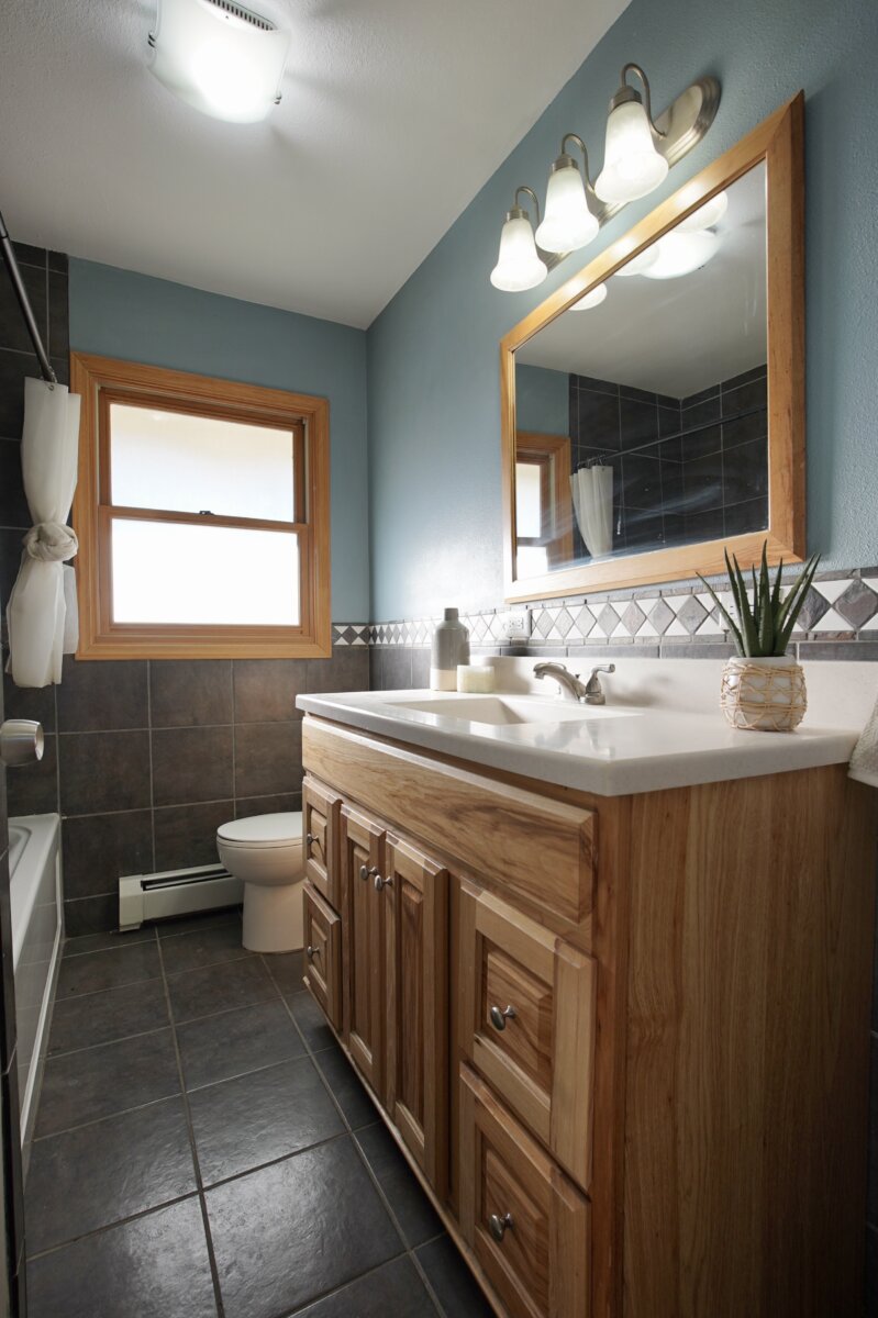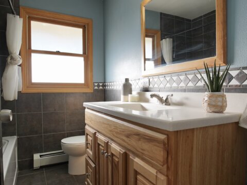 – That’s right. No more dropping socks up and down the stairs. This main level bathroom is perfect for guests with a newer vanity, newer tile, and a oversized tub. And right off the laundry room and guest bathroom, you have a spacious guest room, designed for guest convenience.