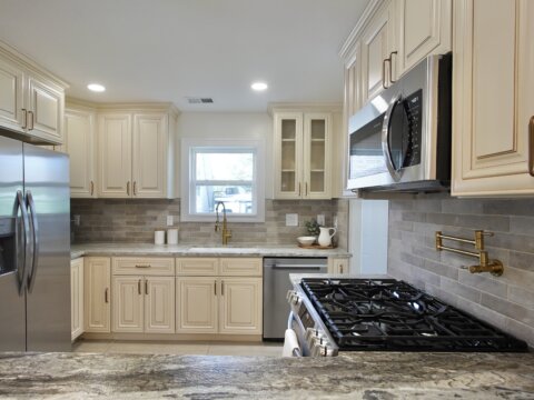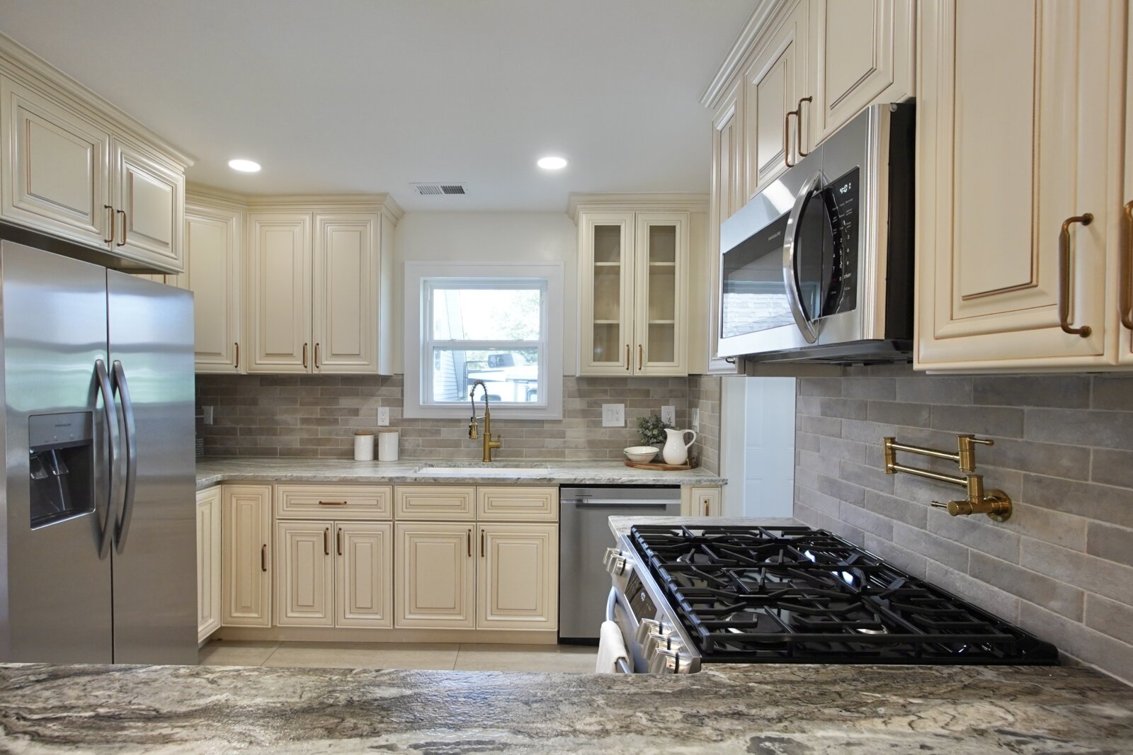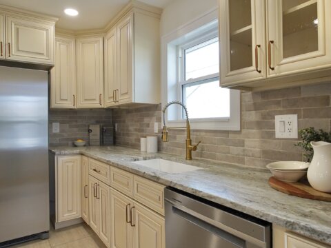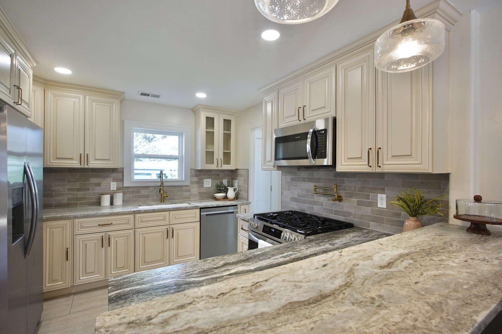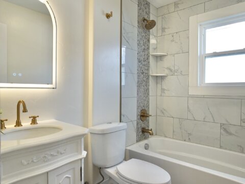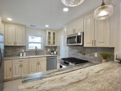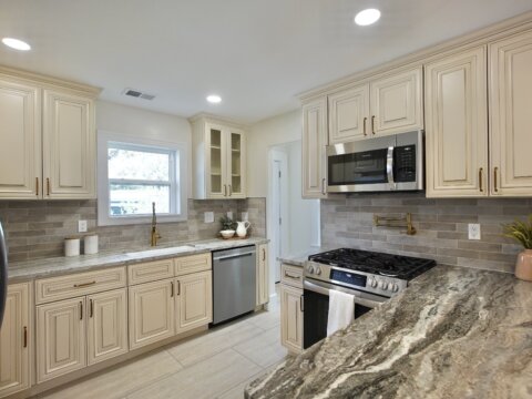 The fully remodeled kitchen features soft-close cabinetry, stainless steel appliances, marble countertops, a pot filler, and a spacious bar area, opening into bright, connected living spaces perfect for entertaining. The main level includes a stunning primary suite with a walk-in closet and a floor-to-ceiling tiled shower.