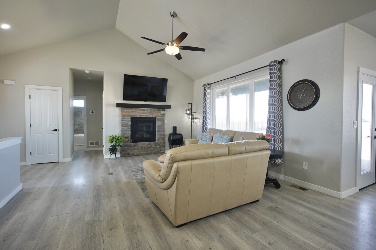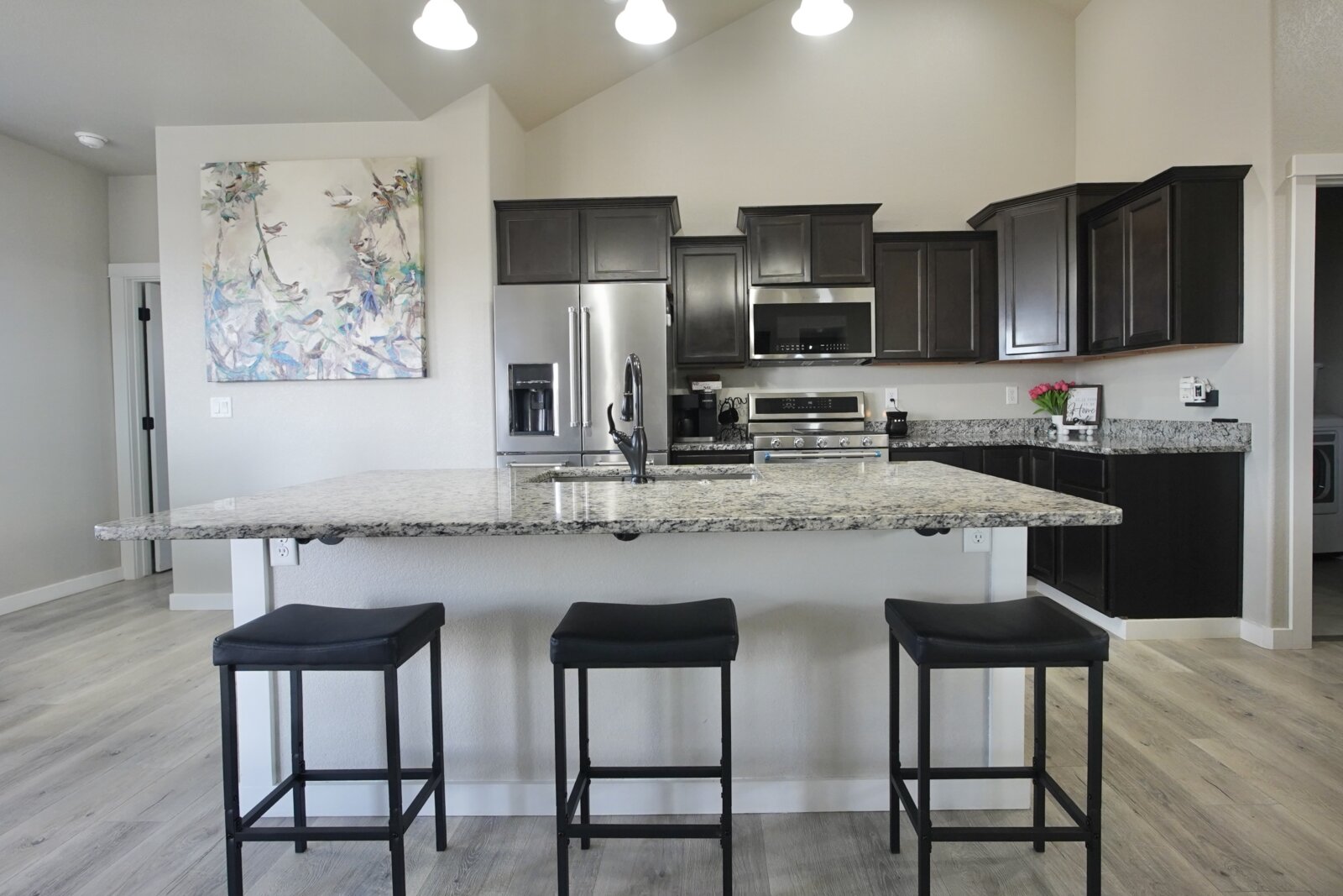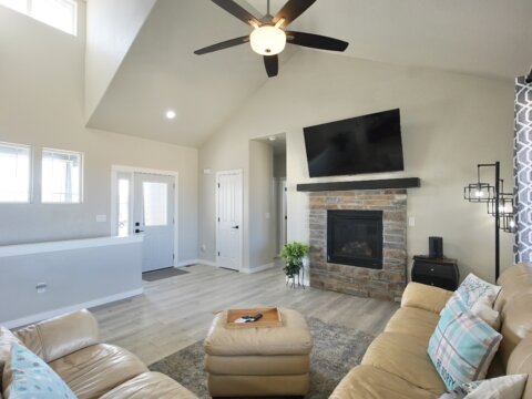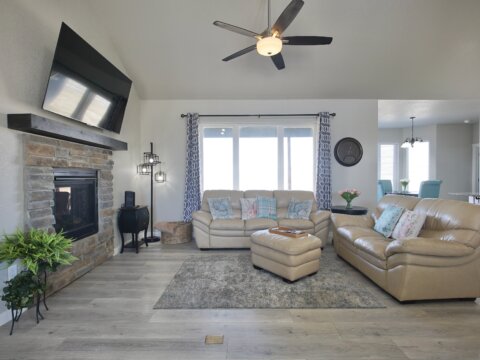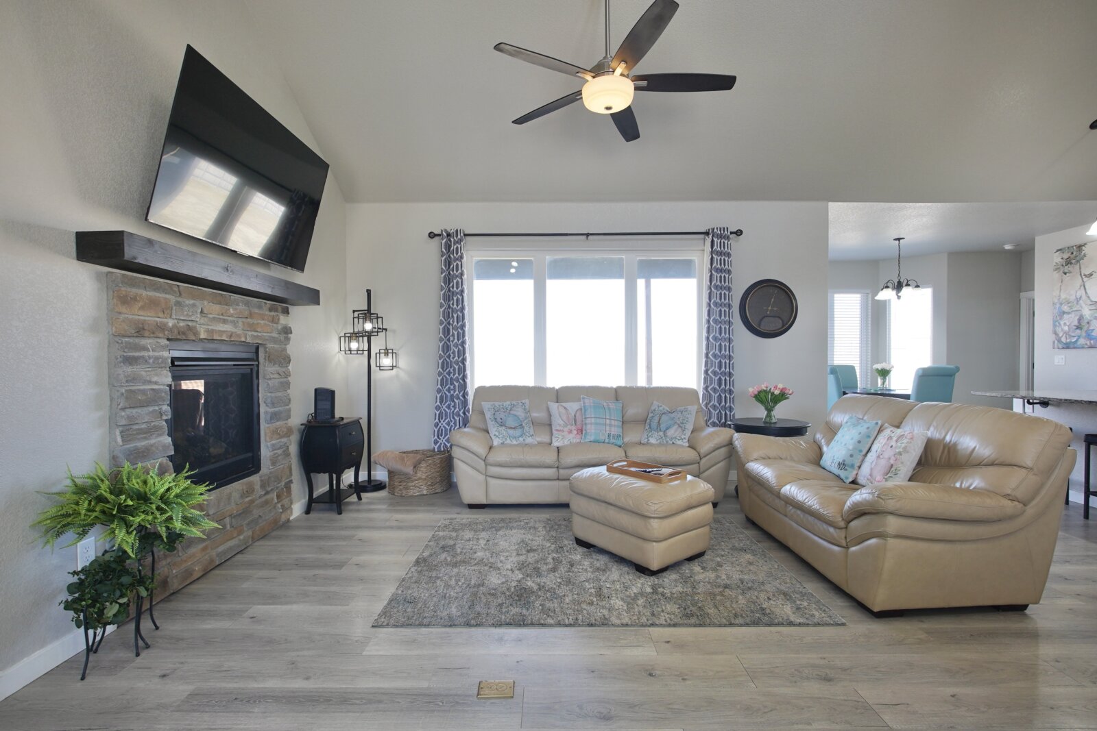 Inside, vaulted ceilings and skylights create a bright, open feel, while the gas fireplace adds warmth and comfort. The kitchen is ready for everyday life and hosting alike, featuring a large island, walk-in pantry, and KitchenAid appliances, including a new microwave/air fryer, dishwasher, and new gas stove.