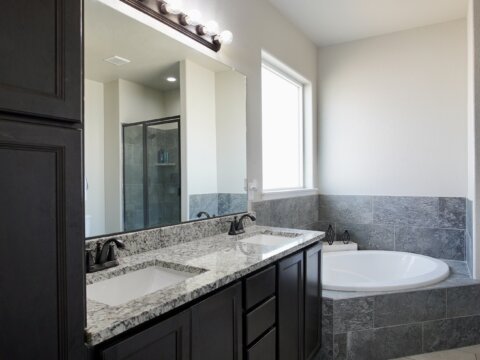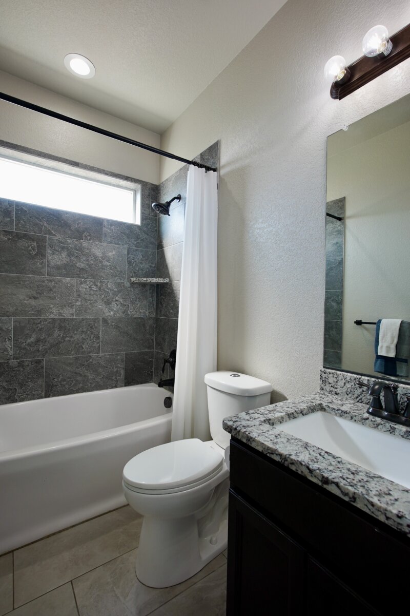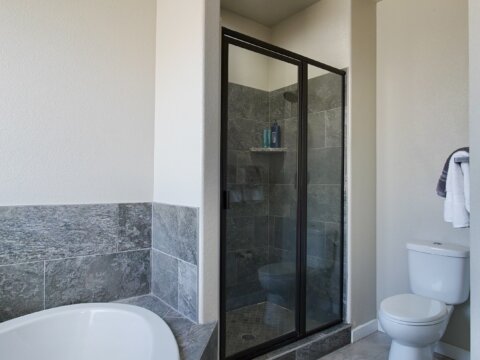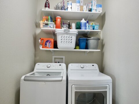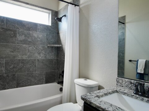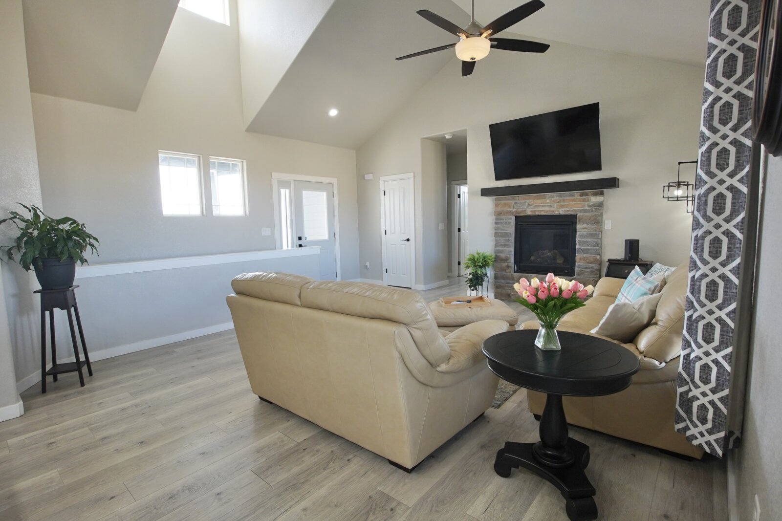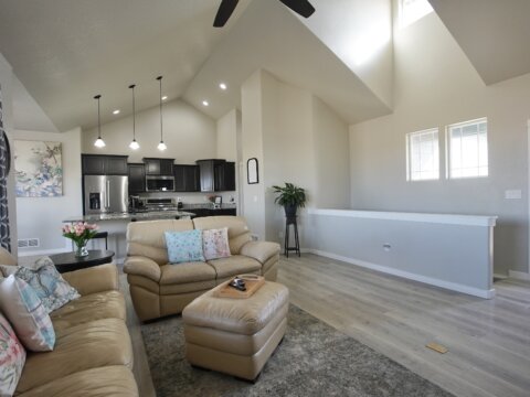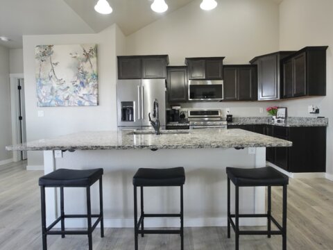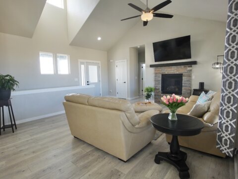 Inside, vaulted ceilings and skylights create a bright, open feel, while the gas fireplace adds warmth and comfort. The kitchen is ready for everyday life and hosting alike, featuring a large island, walk-in pantry, and KitchenAid appliances, including a new microwave/air fryer, dishwasher, and new gas stove.