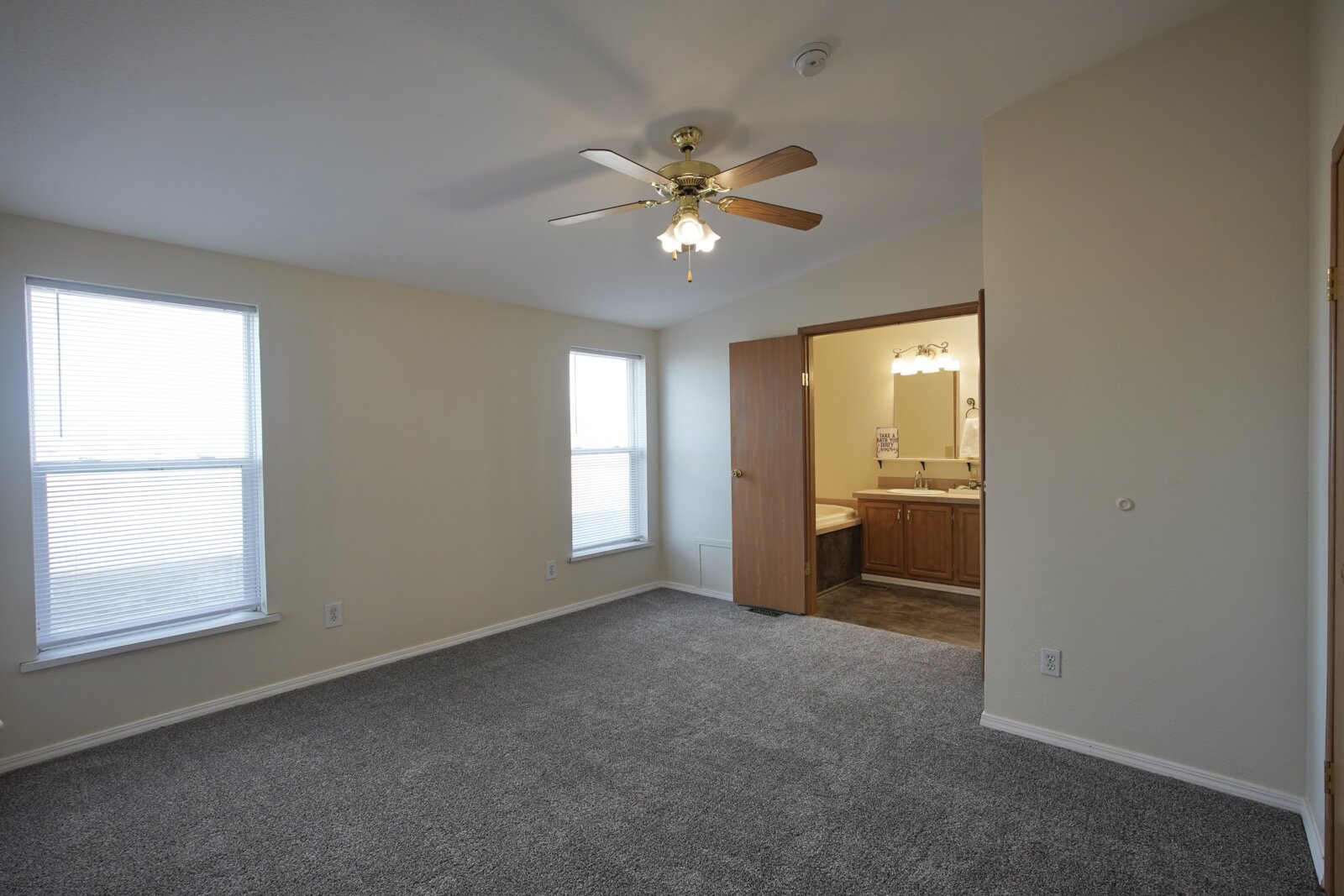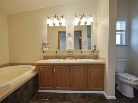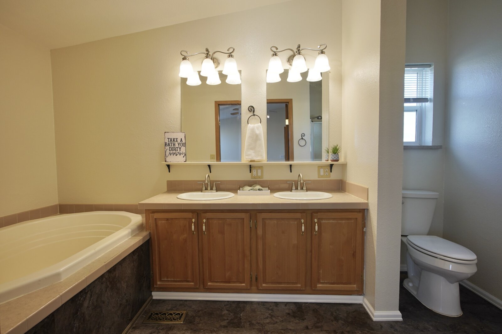 The main level is arranged with two bedrooms and one bathrooms on one side, and a private primary suite on the other, creating ideal separation. The spacious primary suite includes a deep soaker tub and separate shower. Recent updates on the main level include new paint and new carpet in the three bedrooms as well a new roof, and a new 12’x25′ deck.